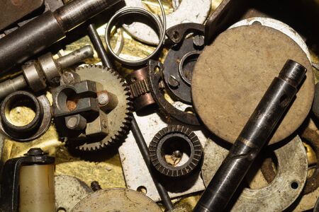 Steampunk background from mechanical clocks details over old metal background. Inside the clock, gears
