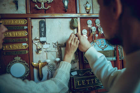 Luxury. Smiling family, caucasian couple looking for home decoration and holidays gifts in household store. Stylish and retro things for greetings or design. Interior renovation, celebrating time.