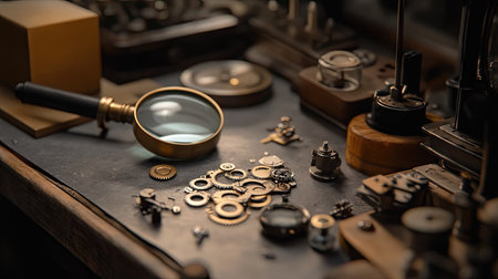 A watchmaker's desk with a magnifying glass and tiny gears, emphasizing precision craftsmanship.