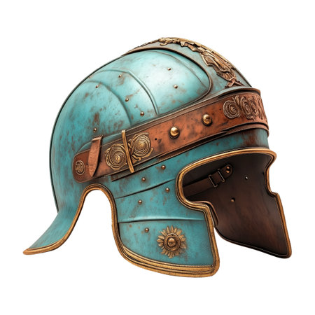 Ancient Roman helmet isolated on a transparent background. Historical metal headgear with intricate engravings, aged patina, and leather details.