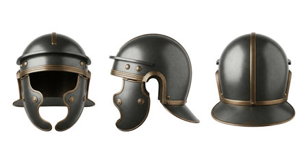 Ancient roman legionary helmet a historical headwear for combat shown in multiple views. A protective armor for a soldier isolated.