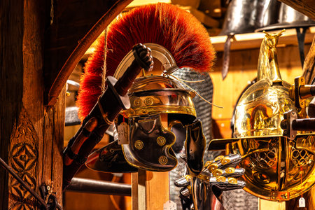 This image showcases highly detailed golden Roman helmets and armor, with a shallow depth of field. The composition highlights the shiny metal surfaces and intricate designs. The lighting appears warm, creating a historical and dramatic ambiance. Suitable for editorial features, historical publications, or visual projects.