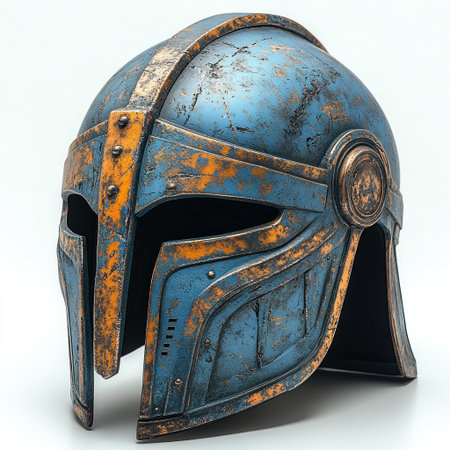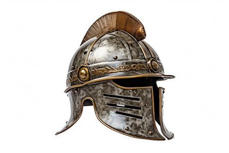 Close up view of an ancient greek helmet, highlighting its intricate details and the weight of history it carries