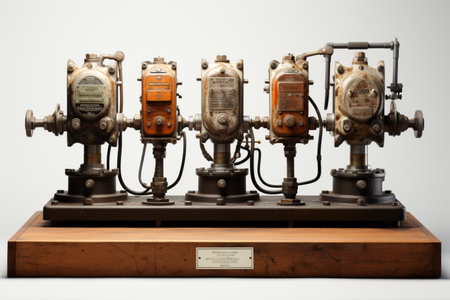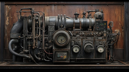 An aged control interface featuring round metallic gauges, aged wooden backdrop, and classic knobs evokes a nostalgic industrial ambiance.