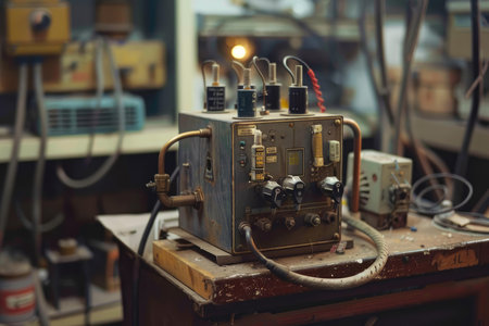 Old analog machine standing on a dusty workbench in a workshop full of tools and components