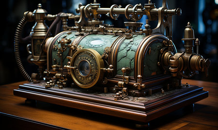 This image features a vintage industrial machine with intricate details, showcasing steampunk elements and artistry, perfect for themes of technology and craftsmanship.