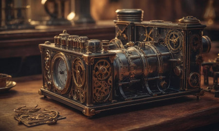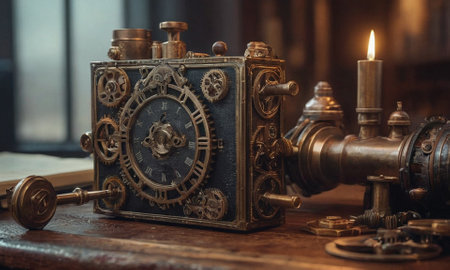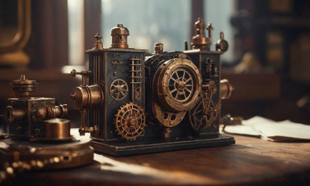 This captivating image showcases an antique mechanical device amidst scattered gears and tools on a vintage wooden table, highlighting the beauty of craftsmanship.