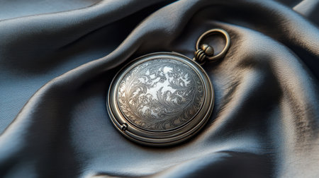 An elegant vintage locket rests gracefully on a silky fabric, featuring an intricate floral design. This stunning piece captures timeless beauty and craftsmanship under soft, warm light.
