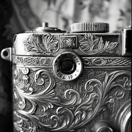 The delicate patterns and engravings on the body of a classic vintage camera capturing the eye. Black and white art.
