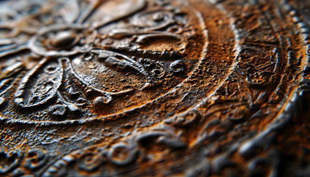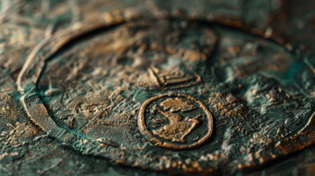 A close-up view of a weathered coin resting on a rusty surface, showcasing rich textures and earthy colors, evoking feelings of age and history.