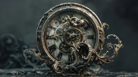 A twisted grandfather clock made entirely out of melted pocket watches the hands moving backwards instead of forwards in a neverending loop