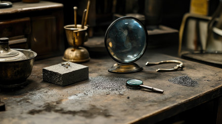 Explore a captivating antique workbench scene featuring a magnifying glass, tools, and mysterious dust, perfect for enthusiasts of crafting and exploration.