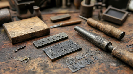 A collection of vintage workshop tools and metal stamps arranged on a rustic wooden table, perfect for creative crafting, lettering, and artistic projects.