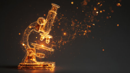 Glowing microscope made of particles and light, symbolizing scientific exploration and innovation. intricate design showcases beauty of technology in research and discovery