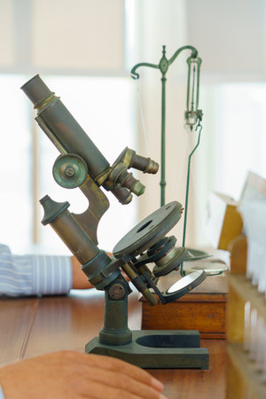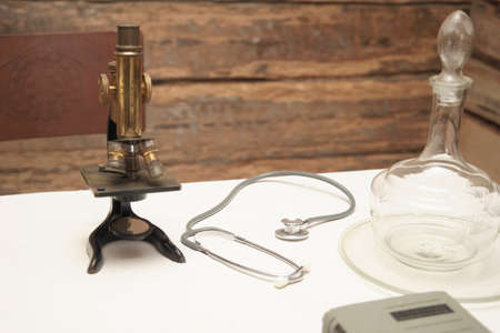 Old microscope on the desk of the doctor in ancient times