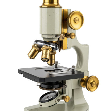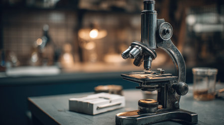 This close-up image captures the intricate details of a vintage microscope, showcasing its lenses and focus mechanism in a scientific laboratory context.