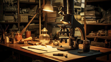 A captivating vintage laboratory setting showcasing an antique microscope, illuminated workspace, and detailed maps, evoking a sense of scientific exploration and historical research.