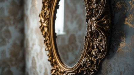 Ornate gold gilded antique mirror hanging elegant wall. Vintage style mirror. Wall decor element. Decorative gilded frame on wall. Classic decorative antique mirror. AI Generative AI generated