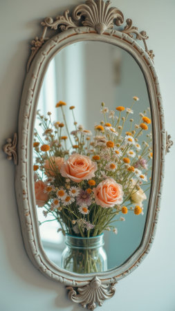 Vintage mirror reflection with floral bouquet of roses and wildflowers in glass jar. That the image is generated using AI.