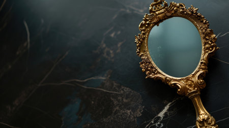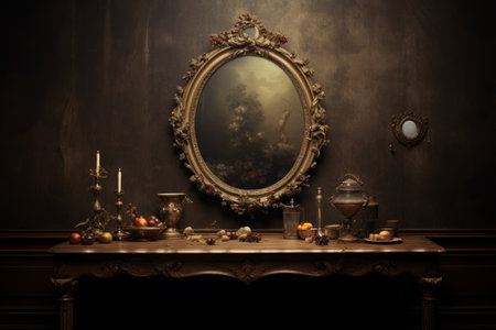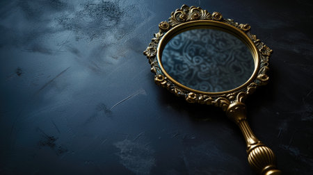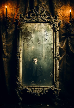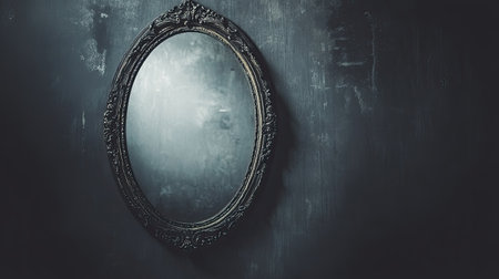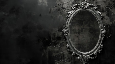Decorative vintage mirror on a dark, eerie background with faint ghostly reflections. Horror concept.