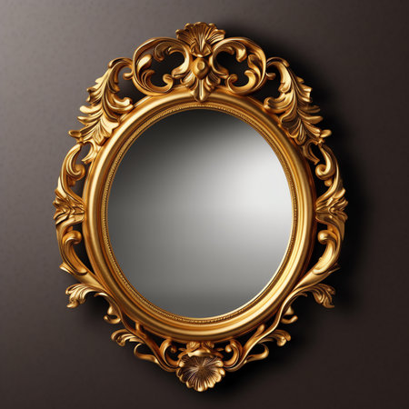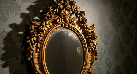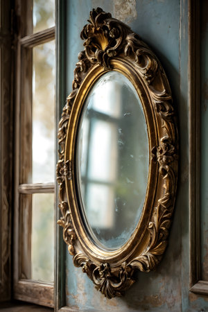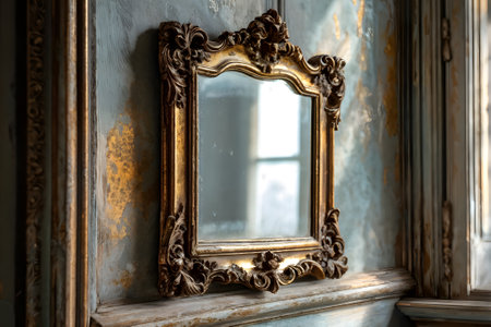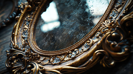 An ornate antique mirror with intricately carved golden frame, reflecting weathered and vintage aesthetic