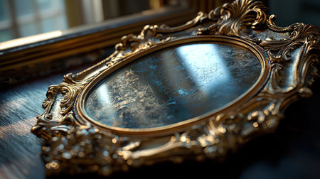 An ornate antique mirror with oval shape and intricate golden frame rests on wooden surface, reflecting soft light