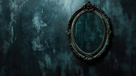 This elegant dark mirror on a textured wall evokes a mysterious atmosphere, ideal for enhancing interior decor or artistic projects.