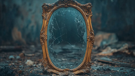 This striking image showcases a cracked antique mirror with an ornate frame, evoking a sense of beauty and mystery. Ideal for artistic context.