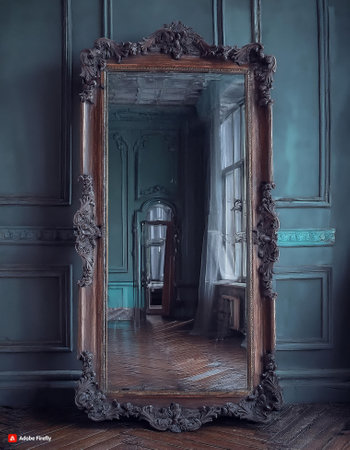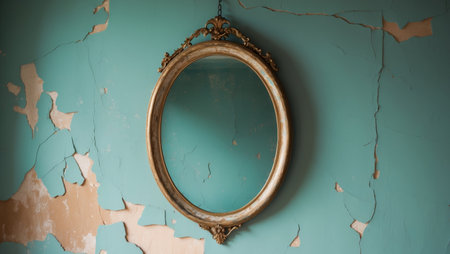 An antique mirror with chipped paint and blurry reflections symbolizing the blurred lines between reality and a distant memory