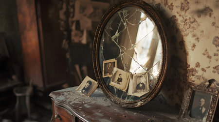 Cracked and weathered mirror reflecting faded, nostalgic family photographs in the decaying interior of an abandoned, neglected house.