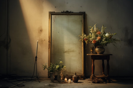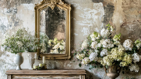 Discover a serene interior scene featuring elegant vintage decor, beautiful floral arrangements, and an ornate mirror against a textured weathered wall, creating a cozy atmosphere.