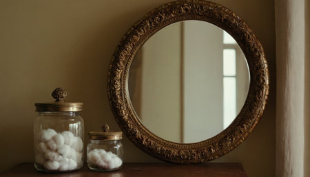 Vintage mirror with cotton balls in glass jar on wooden table.