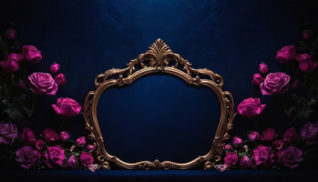 Antique mirror with pink flowers and ornate frame reflecting on pastel blue wall. That the image is generated using AI.