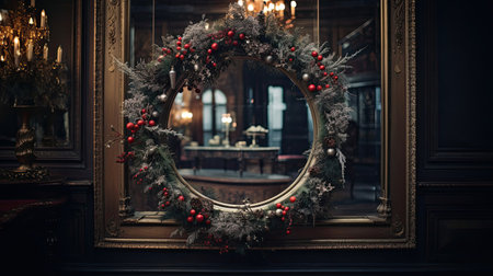 Adorned Wreath on Antique Mirror Reflecting Festive Room Ambiance