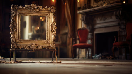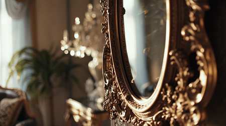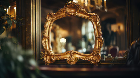 An opulent gold mirror reflects a stunning antique painting, a glittering crystal chandelier, and the elegant details of a luxurious interior. This image showcases a baroque design with ornate gold detailing, perfect for illustrating concepts of luxury, history, and refined taste. The reflection provides a unique perspective on the room's classic decor, ideal for interior design projects, articles on historic architecture, or marketing materials for high-end brands. The image evokes feelings of wealth and vintage charm.