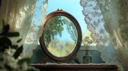 A mirror on a vanity reflecting a scenic outdoor view, framed by delicate lace curtains.