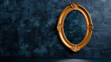 This elegant oval mirror boasts an intricate gold frame, set against a dark textured wall, perfect for adding a touch of sophistication to any space.