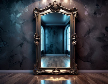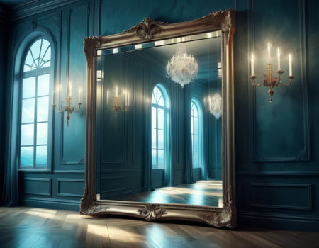 An ornate antique mirror reflects a luxurious room with deep blue walls, elegant chandeliers, and opulent wall sconces.. AI Generation
