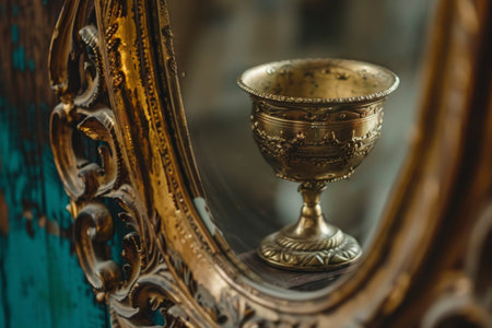 The reflection of a golden trophy in a mirror. --ar 3:2 Job ID: fd4d3927-1aab-4d18-acc1-71b12cfd8d0d
