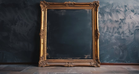 A panoramic, wide-angle cinematic photograph of an ornate, empty gold frame leaning against a decaye