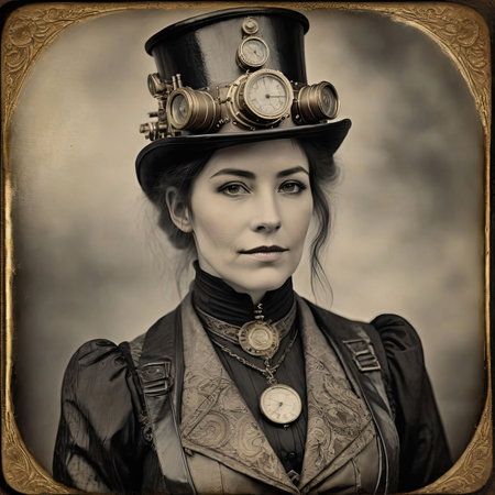 Vintage photograph of a beautiful steampunk girl in a wet dish from the 1890s. aged and scratched Victorian photo. junk journal. In a suit and dress with a hat with a watch and mechanisms