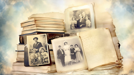 Old, vintage photographs rest on an antique table, creating a warm, nostalgic atmosphere perfect for antique shops or vintage studios.