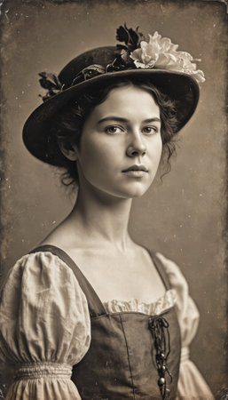 Vintage black and white portrait of a young woman wearing a hat with a concentrated expression on her face. Sepia, aging effect, scuffs. The atmosphere of the past, retro style.