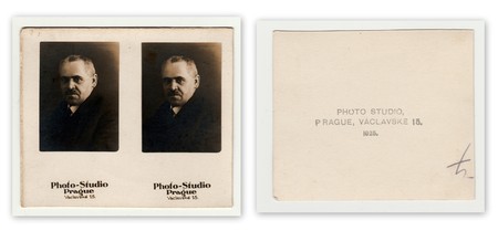 PRAGUE, THE CZECHOSLOVAK REPUBLIC, 1925: Front and back of vintage studio portrait photo of man, 1925.