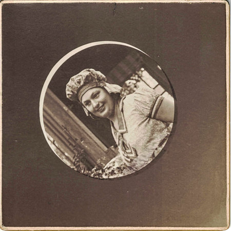 The vintage photo shows young girl wears traditional costum. Circa 1910s