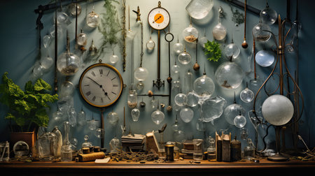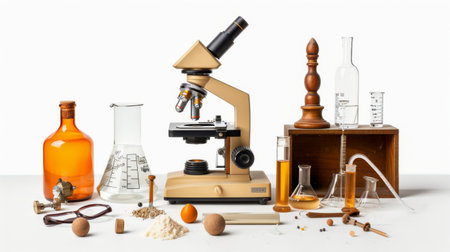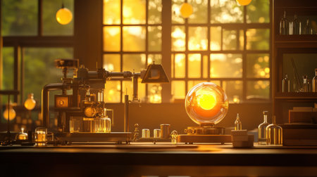 A serene laboratory scene bathed in warm sunlight, featuring various scientific equipment and glassware arranged artfully on a wooden surface.