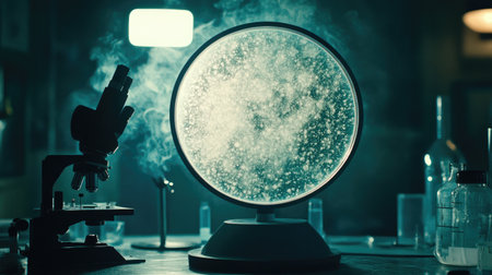 A captivating scientific setup featuring a microscope and a foggy globe in a dimly lit laboratory, evoking a sense of exploration and discovery.