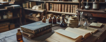 An old library scene featuring vintage books and glass bottles on a rustic wooden table, evoking a sense of nostalgia.