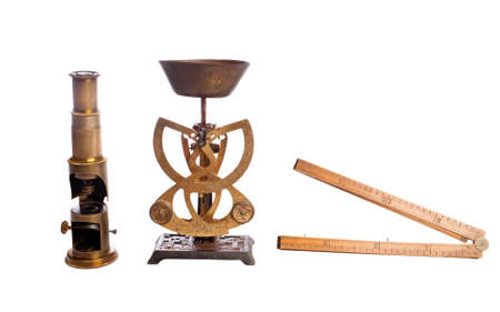 antique pharmacy, science, medicine and research concept - close up of old laboratory equipment