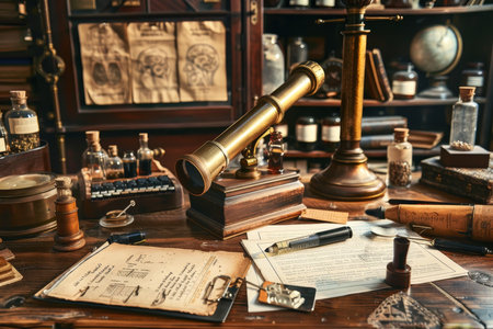 A vintage scholar's or explorer's desk filled with various objects like a model sailing ship, a microscope, maps, books, and magnifying glasses. The dusty, atmospheric lighting suggests a scene of historical discovery, research, and adventure. This evocative still life captures a sense of curiosity and intellectual pursuit.
